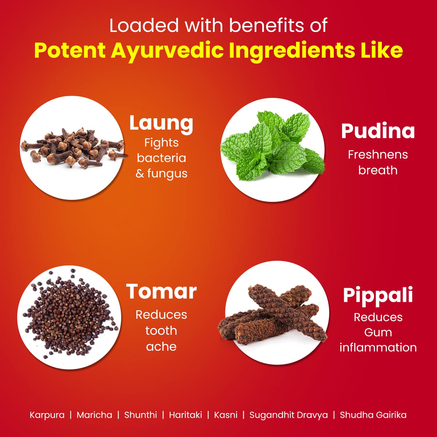 - Herbal Ingredients: Dabur Lal Dant Manjan is formulated with a blend of herbal ingredients, which may include cloves, camphor, mint, and other traditional herbs known for their oral health benefits.
